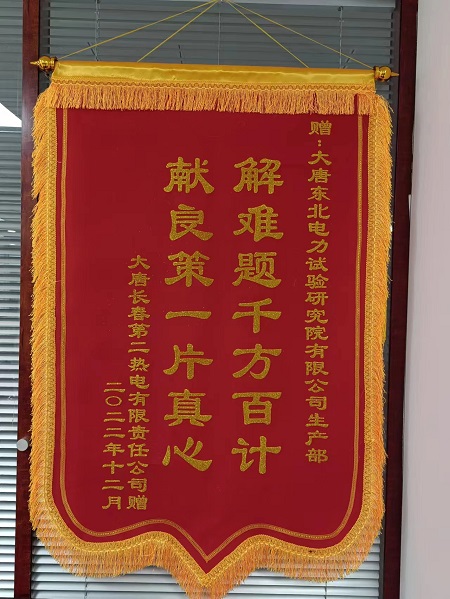 锦旗既代表一份认可和感谢,同时也代表着一份责任和嘱托,东北电力试验研究院将坚决落实好集团公司赋予的生产技术服务职责,将提高技术监督服务质量作为第一亮点工作来抓,进一步增强服务意识,急企业之所急,想企业之所想,全力以赴做好生产技术服务工作,不断提升技术服务能力水平和企业满意度。