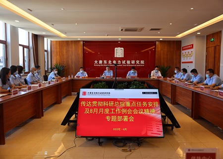 8月9日,大唐东北电力试验研究院召开专题部署会,传达贯彻科研总院重点任务安排及8月份月度工作例会会议精神,东北电力试验研究院党委书记、执行董事高岩松、副院长衣心亮、总工程师王凤良、副院长宁玉恒出席会议。