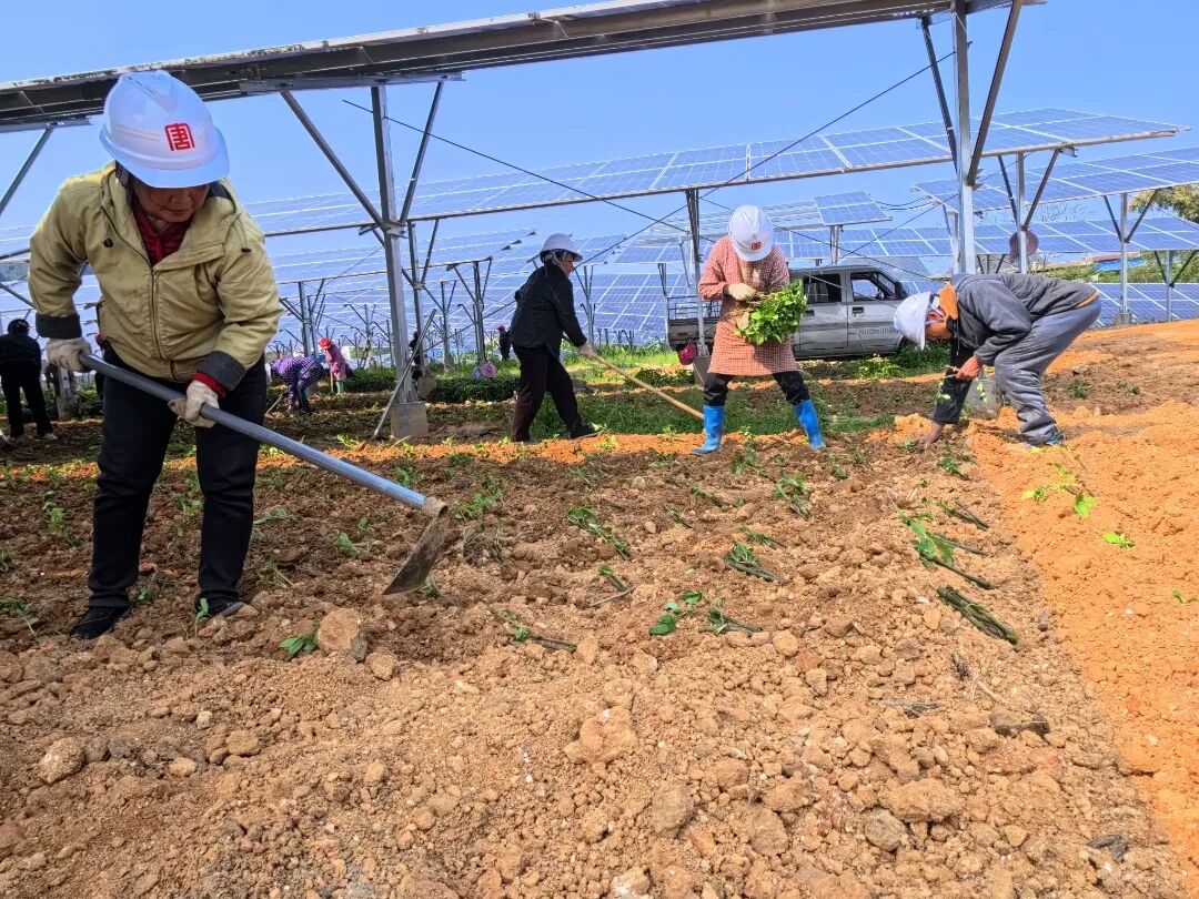 3月4日,大化瑶族自治县大化红旗光伏发电项目现场,一排排深蓝色光伏板整齐排列,板下田垄间,村民们抢抓农时栽种南板蓝根,春